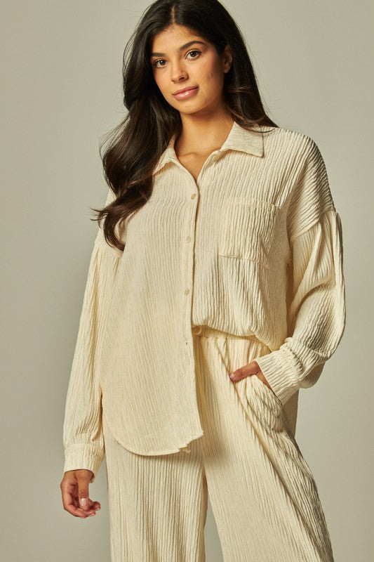 Elevate your style with the versatile Cassie Crinkle Set. This set features a button down shirt and pants, perfect for dressing up or dressing down. Made for all occasions, this set will effortlessly take you from day to night with its timeless design and comfortable fit.