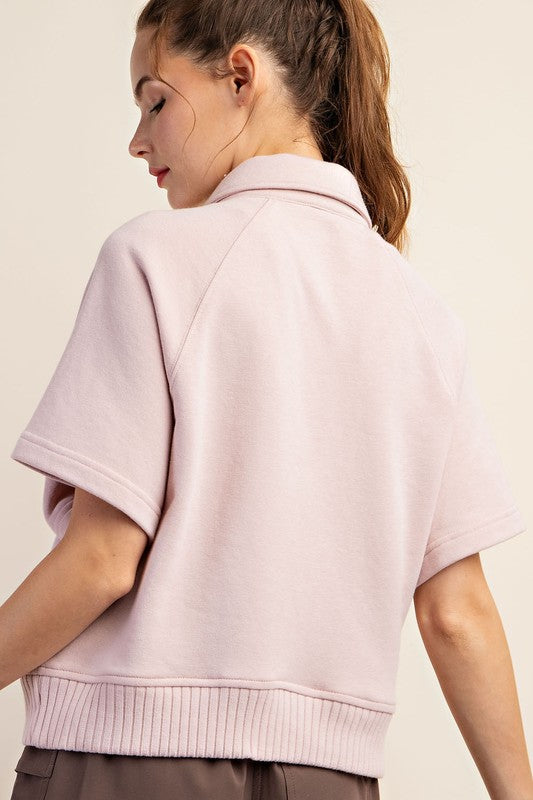 Stay stylish and comfortable with our Pink French Terry Short Sleeve Collared Top. Made with soft and breathable fabric, it's perfect for any casual or active occasion. This versatile top will keep you looking and feeling great all day!